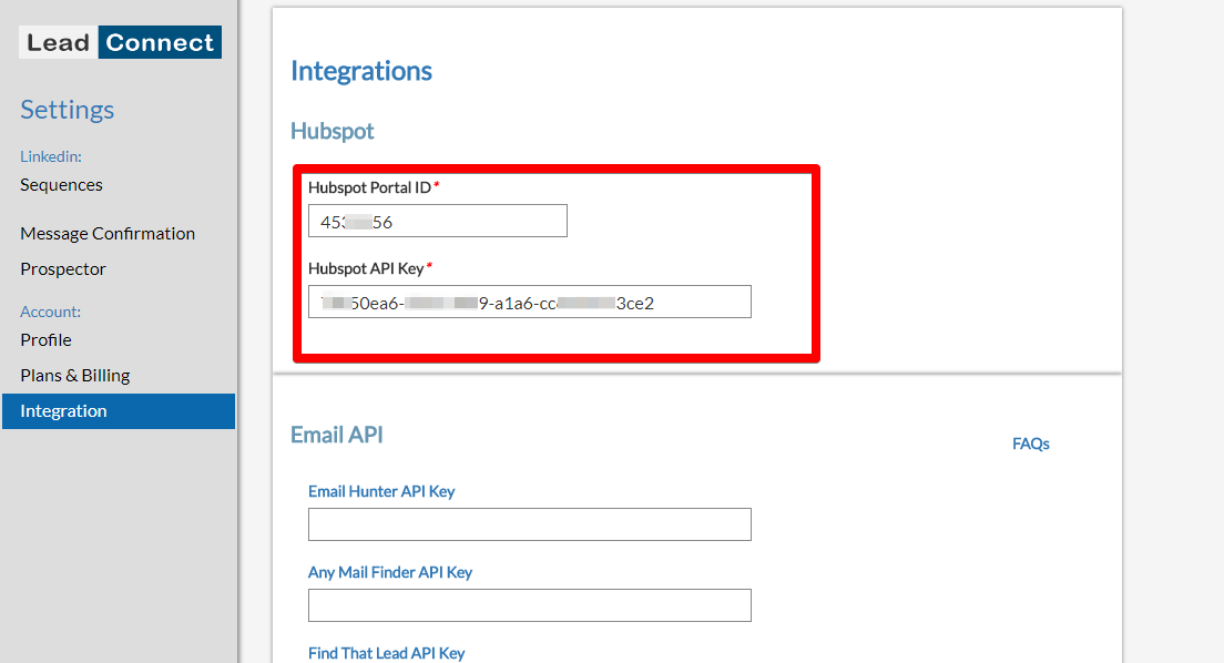 - Copy and Paste the Hubspot API Key as well as the Portal Id to the extension’s “Integrations Page”.
